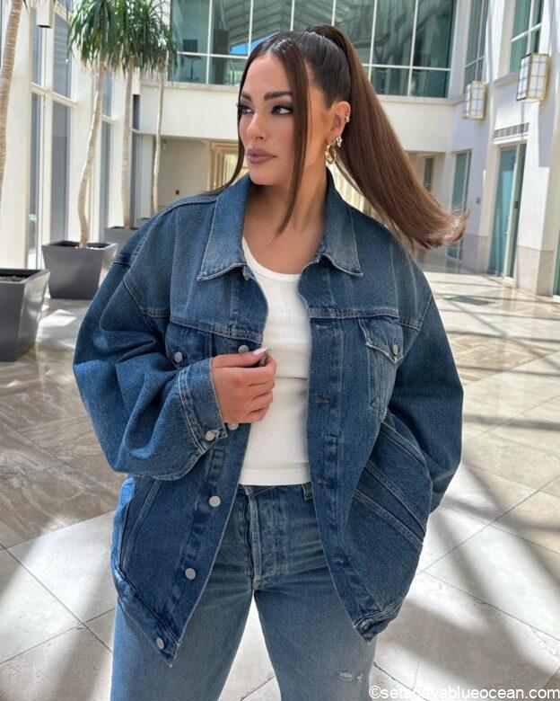 In the photo, Ashley is hanging a bag with her hands covering her breasts, and even after giving birth to twins in 2022 and becoming a mother of three, she continues to lead the body positivity movement with her unchanged beauty.