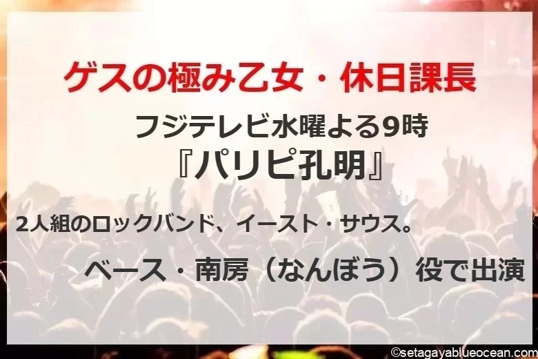 ゲスの極み乙女・休日課長、2人組のロックバンド、イースト・サウス。ベース・南房(なんぼう)を演じる