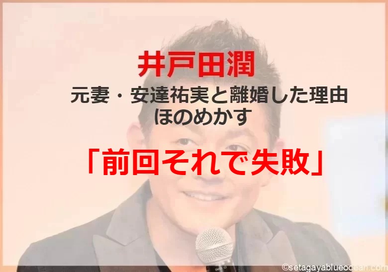 お笑いコンビ「スピードワゴン」の井戸田潤(51)が13日放送の日本テレビ「踊る!さんま御殿!!」(火曜後8・00)に出演し、元妻で女優の安達祐実(42)と離婚した理由をほのめかす場面があった。