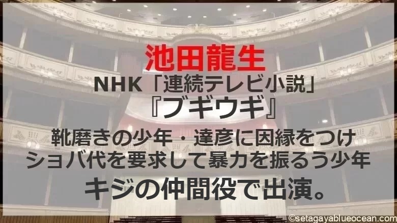 池田龍生、靴磨きの少年・達彦に因縁をつけ、ショバ代を要求して暴力を振るう少年、キジの仲間役で出演。