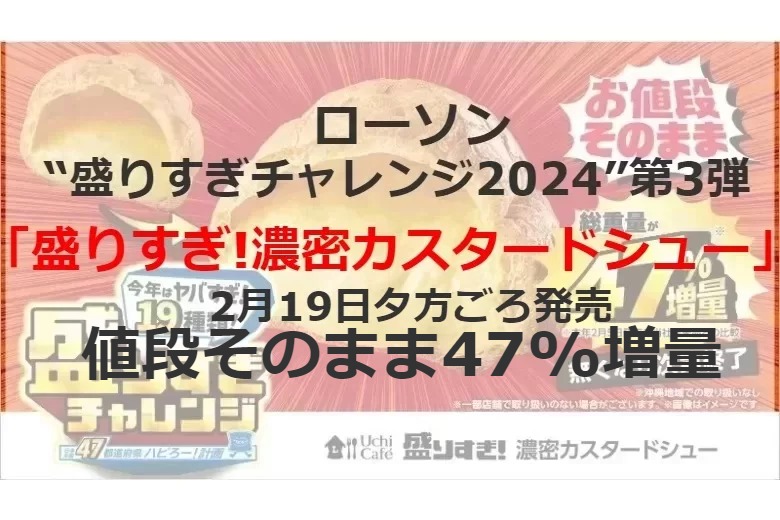 「盛りすぎ!濃密カスタードシュー」は、濃密カスタードシューを総重量1.47倍にした(2024年2月5日発売の従来品との比較)。“たまごの美味しさがつまった”カスタードクリームをたっぷり楽しめる。1包装当りのカロリーは、288kcal(従来品は191kcal)。なお、沖縄エリアのローソンでは商品価格が異なる。