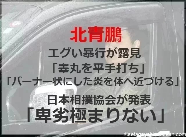理事会後に配布された文書では北青鵬の暴行が明るみに。「顔面、背中及び睾丸(こうがん)への平手打ち等の暴行」「ほうきの柄、またはまわしで作った丸太様の棒で臀部(でんぶ)を打つ暴行、殺虫剤スプレーに点火してバーナー状にした炎を(被害を受けた)AやBの体に近づける暴行」と詳細が記された。