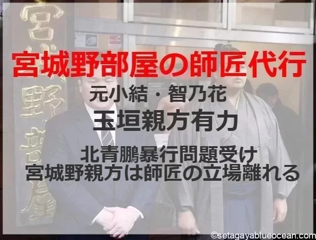 大相撲の幕内・北青鵬(22=宮城野部屋)の暴行問題による引退により、監督義務違反で師匠の立場を外れる宮城野親方(元横綱・白鵬)の師匠代行に、伊勢ケ浜一門の大島部屋の部屋付き親方、元小結・智乃花の玉垣親方(59)が有力になっていることが26日、分かった。部屋関係者によれば、早ければ28日から大阪市内の部屋で指導するという。