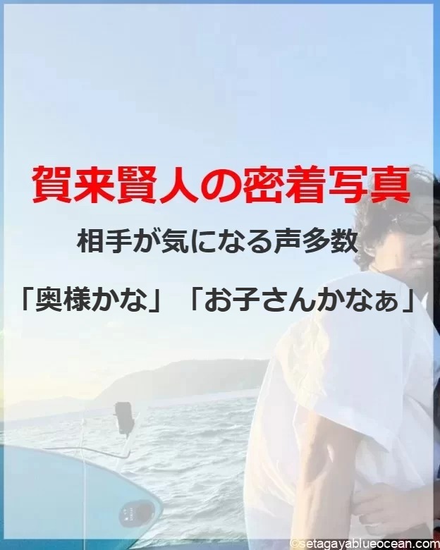 賀来さんは船とビーチパラソルの絵文字を添えて、1枚の写真を投稿。船の上で撮影したと思われるショットを公開しました。サングラスを掛けてカメラに顔を向ける賀来さんの隣には、賀来さんに抱き着くように密着する誰かがいるようで、腰回りに腕を回している手先が見えています。