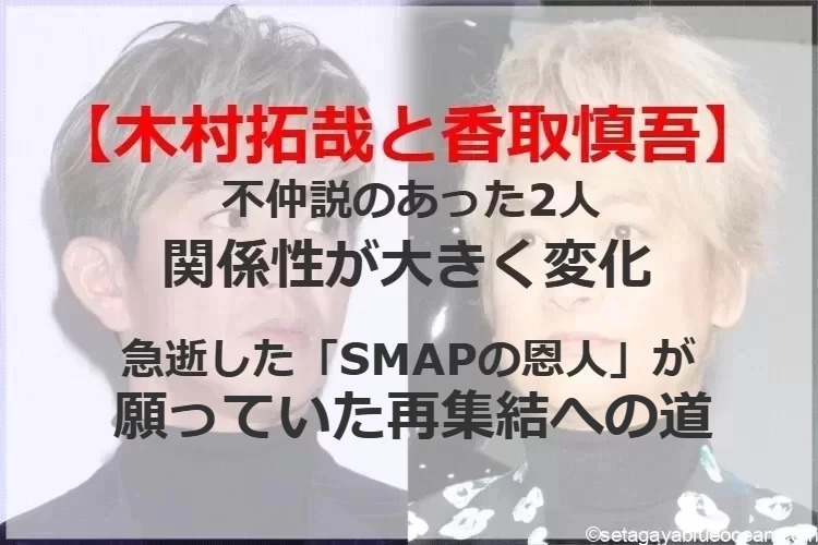 SMAPが所属した旧事務所も4月から体制が大きく変わり、4人と木村を隔ててきた垣根もなくなる。香取は解散時にファンに向けて「SMAPを応援してくれた皆様をSMAPを愛してます」と綴った。恩讐を越えた“ラブコール”は木村の耳にも届いているはず。再び5人が集まる日を天国の黒木さんも楽しみにしているに違いない。