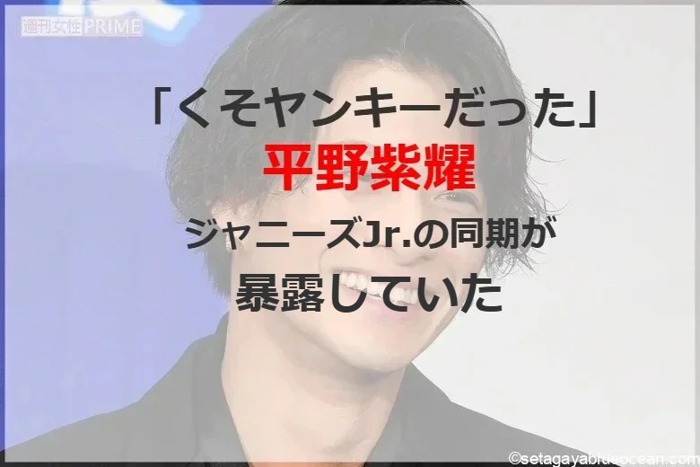 また、平野は高いところから飛び降りたり、電柱を殴って骨折したりするなどヤンチャすぎる幼少期を過ごしていたもよう。平野とジャニーズJr.の同期だったカウアン・オカモトも《平野はくそヤンキーだった》と暴露している。
