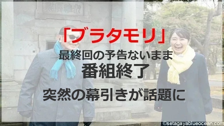 3月いっぱいでレギュラー放送終了と同局からアナウンスがあった「ブラタモリ」だが最終回については事前告知なし。この日の放送では今回が最終回だという“お知らせ”のないまま終了。だが、通常ある次回予告がなかったことでネット上が騒然。「予告編がなかったということは最終回だったの!?」「えっブラタモリ、もしかして今日が最終回!?」「次回の予告が入ってなかったはナゼ?」と疑問の声が上がった。