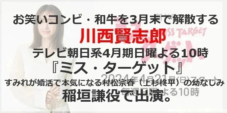 お笑いコンビ・和牛を3月末で解散する川西賢志郎、すみれが婚活で本気になる村松宗春(上杉柊平)の幼なじみ・稲垣謙役を演じる。