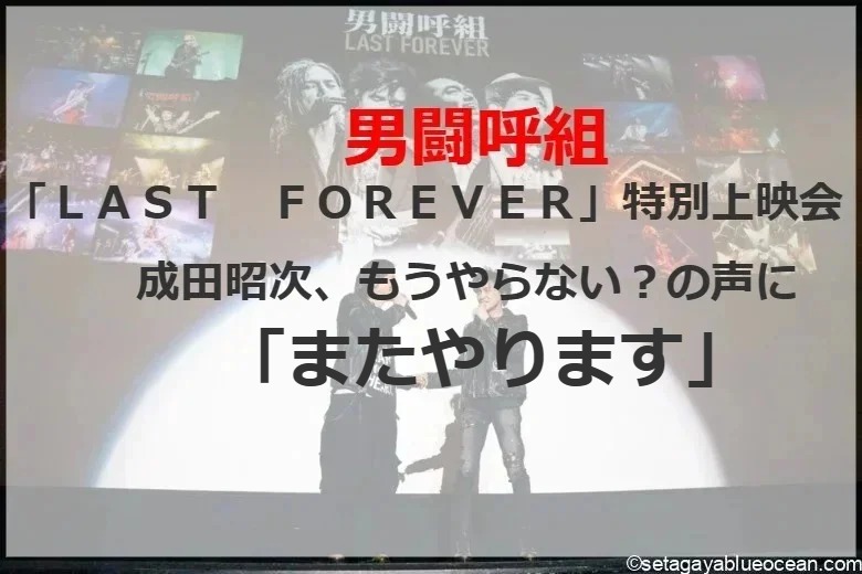 同作は昨夏の日本武道館公演、日比谷野音公演の模様を収録したライブ映像2枚と、1年間の軌跡を追ったドキュメンタリー映像の特典盤1枚の3枚組みボックス。客席の最後方で共に観賞していた岡本は「男闘呼組、解散したんじゃないの? 解散したって言って(ファンの)みんな、泣いていたじゃん。この人たちを見ると、何で泣けるんだろうっていうね」。成田は「一瞬のうちに感動の渦が押し寄せてくる。ライブの時もそうですけど、今日の上映会も、こんなにたくさんの愛おしい男闘呼組のファンの皆さんに集まっていただいて」と感謝した。