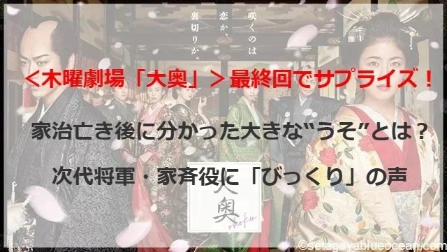 俳優の小芝風花さん主演の木曜劇場「大奥」(フジテレビ系、木曜午後10時)の最終第11話が、3月28日に放送された。家治(亀梨和也さん)の死後、大きなうそをついていたことが分かり、ラストで次の将軍、家斉が登場。演じた俳優が話題になった。