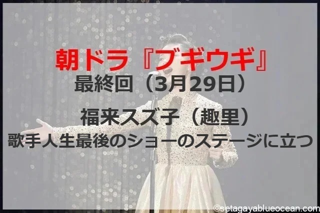 「ブギの女王」と呼ばれるスター歌手として、戦後の日本をブギのリズムで明るく照らすヒロインの波瀾万丈な半生を描く連続テレビ小説『ブギウギ』(NHK朝ドラ)。最終回となる第126回(3月29日放送)では、歌手を引退するスズ子の「さよならコンサート」が開かれる。