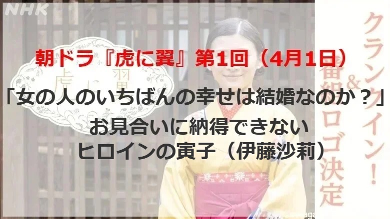 昭和6年(1931年)初夏、東京を舞台に物語が始まる第1回(4月1日放送)。女学校に通う少女・猪爪寅子(伊藤沙莉)は、父・直言(岡部たかし)と母・はる(石田ゆり子)から次々とお見合いを勧められていた。