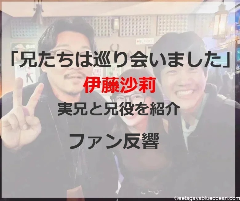 この投稿に上川が「撮影中に何度か沙莉ちゃんのお兄さんの夢を見ました。本当にお会いできて、感動しました。嬉しかったです!」と反応し、ファンからも「素敵兄妹」「両方兄ですね」「仲良しこよしだね!」「日本があこがれる兄妹になりつつある!」「お兄さん達に囲まれてる末っ子沙莉ちゃんかわいい」「いいスリーショット!」などの声が寄せられている。