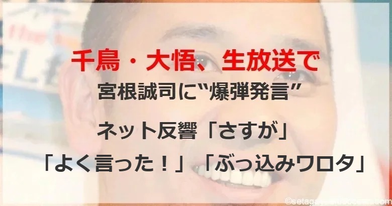 お笑いコンビ「千鳥」が7日放送のフジテレビ系「Mr.サンデー」(日曜後10・00)のエンディング部分に出演。大悟(44)がMC宮根誠司(60)に向かって“爆弾発言”をし、ネットをざわつかせた。
