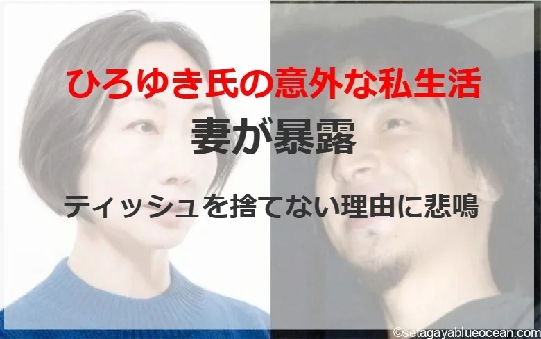 ゆかさんは「(ひろゆきが)自分で掃除とかを絶対にしないで、汚すだけ汚して『空気が悪い』って私に怒ってくる」と不満を吐露。「(ひろゆきは)ティッシュもゴミ箱に捨てられない」そうで、YouTubeをしている際に「しゃべりながら鼻をかんだティッシュが床にいっぱい散らかっていて、終わった後に私が全部片付けてる」と明かした。