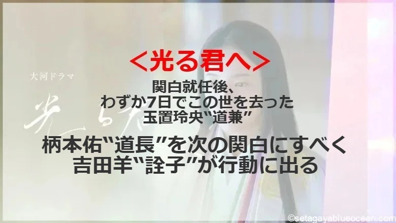 道隆の死後、一条天皇が次の関白にと命じたのは道兼(玉置玲央)だった。道兼は民のために良い政をと奮起していたが、関白就任の日に倒れ、7日後にこの世を去る。
