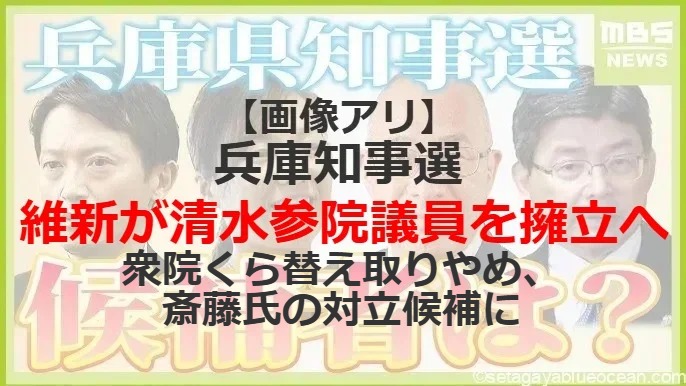 - 清水氏は衆院兵庫8区(尼崎市)にくら替えして立候補を予定していたが、維新は出直し選挙への出馬を表明した斎藤氏への対立候補に据える考え。