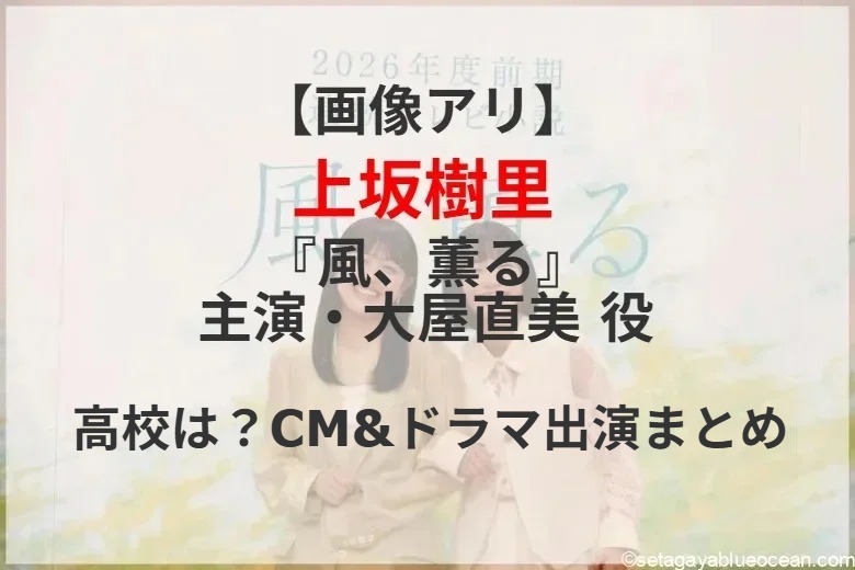 2026年度前期 NHK連続テレビ小説『風、薫る』の見上愛に続くもう一人のヒロインが、上坂樹里に決定。見上愛演じる一ノ瀬りんと“最強のバディ”になっていく大家直美を上坂樹里が演じる。さて上坂樹里さんの出身高校は?過去出演したCMやテレビドラマは?