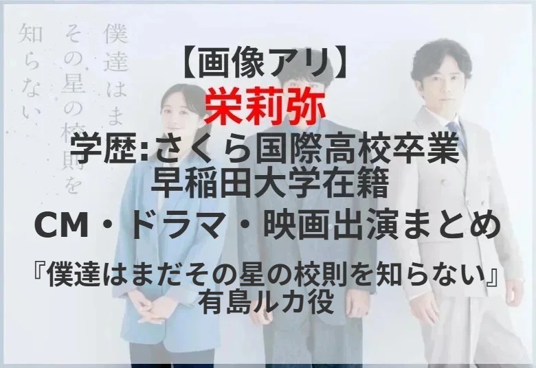 7月14日よりカンテレ・フジテレビ系で放送がスタートする磯村勇斗主演の月10ドラマ『僕達はまだその星の校則を知らない』。3年葵組の有島ルカ役を栄莉弥さんが演じる。さて栄莉弥さんの出身高校? 在籍している大学? これまで出演したCM・テレビドラマ・映画作品?