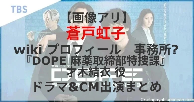 人気グループ「King & Prince」の高橋海人さんと俳優の中村倫也さんがダブル主演を務める7月期のTBS系金曜ドラマ「DOPE 麻薬取締部特捜課」(金曜午後10時)に、今年4月にドラマデビューした蒼戸虹子さんが才木優人(髙橋海人)の妹・才木結衣を演じる。蒼戸虹子さんのプロフィール? これまで出演したテレビドラマやCMは?