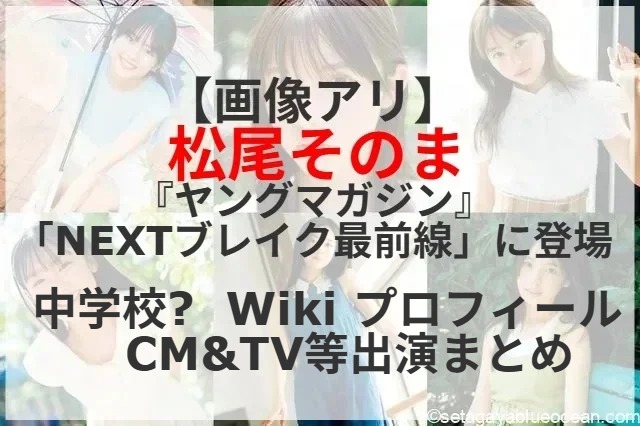 7月28日発売の「ヤングマガジン」(講談社)にドラマ、雑誌、CMなどで活躍する女優やモデルを紹介する「NEXTブレイク最前線」を掲載。6人が登場し、その一人が松尾そのまさんだった。松尾そのまさんが通っている中学校は? これまで出演したCMやTV等映像作品は?