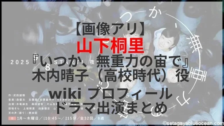 2025年9月8日開始予定、NHK夜ドラ「いつか、無重力の宙で」。高校時代、「一緒に宇宙に行こう」と夢を語り合った天文部の女子4人組。 大人になってそれぞれの道を歩む中、ふと忘れていたかつての〈夢〉と再会する。木内晴子(きうち・はるこ)役を山下桐里さんが演じる。