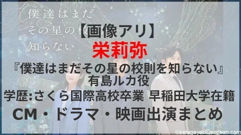 7月14日よりカンテレ・フジテレビ系で放送がスタートする磯村勇斗主演の月10ドラマ『僕達はまだその星の校則を知らない』。3年葵組の有島ルカ役を栄莉弥さんが演じる。さて栄莉弥さんの出身高校? 在籍している大学? これまで出演したCM・テレビドラマ・映画作品?