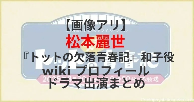 24時間テレビ ドラマスペシャル『トットの欠落青春記』戦争が終わった直後の1946年からスタート。「神様は、どんな人間にも、必ず、飛び抜けた才能を1つ与えてくださっている」――。子どもの頃から落ち着きがなく、興味のあることに夢中になると周りがまったく目に入らない、猪突猛進な行動力で女学生時代も数々のハプニングを起こしていく徹子… 和子役を松本麗世さんが演じる。松本麗世さんのプロフィールは? これまで出演したテレビドラマ作品は?