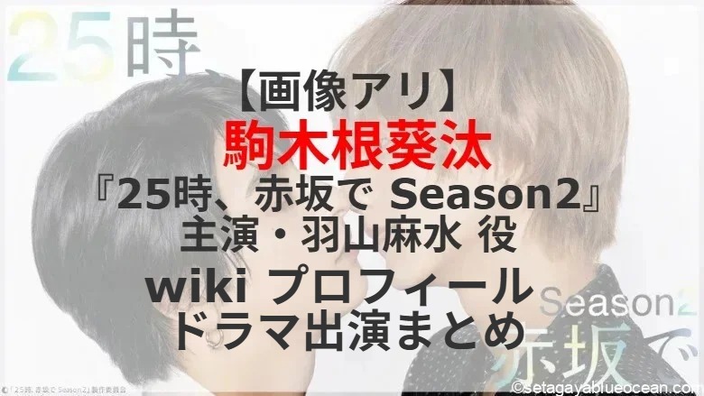 俳優の駒木根葵汰(こまぎね・きいた/25)と新原泰佑(にいはら・たいすけ/24)がW主演を務めたテレ東系ドラマ「25時、赤坂で」の続編「25時、赤坂で Season2」(10月1日(水)スタート 毎週水曜深夜1時〜放送)が決定。主演・羽山麻水 役を駒木根葵汰さんが演じる。駒木根葵汰さんのプロフィールは? これまで出演したテレビドラマは?