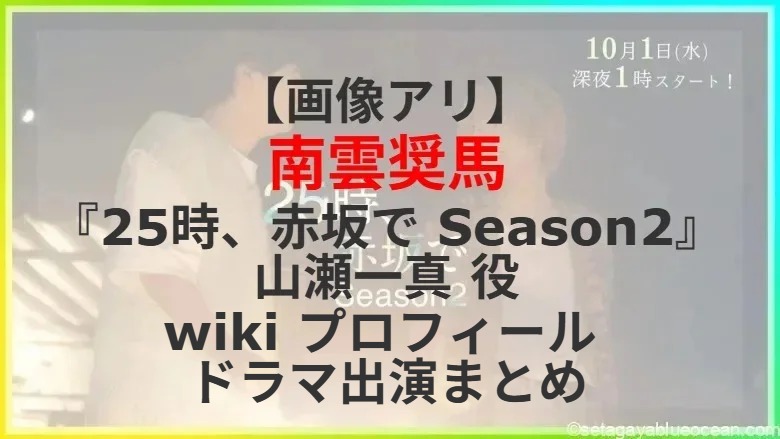 俳優の駒木根葵汰(こまぎね・きいた/25)と新原泰佑(にいはら・たいすけ/24)がW主演を務めたテレ東系ドラマ「25時、赤坂で」の続編「25時、赤坂で Season2」(10月1日(水)スタート 毎週水曜深夜1時〜放送)が決定。佐久間はじめ(宇佐卓真)の後輩で、「昼のゆめ」の共演者・山瀬一真 役を南雲奨馬さんが演じる。南雲奨馬さんのプロフィールは? これまで出演したテレビドラマは?