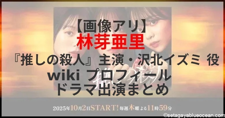 田辺桃子、横田真悠、林芽亜里がトリプル主演する読売テレビ・日本テレビ系ドラマ「推しの殺人」。殺人の隠蔽をした3人組アイドル・ベイビー★スターライトが次々と苦難に見舞われ、日本中を騒がせていた未解決連続殺人事件にも巻き込まれていく物語。3人組アイドル「ベイビー★スターライト」グループのセンターに抜擢されテルマから敵視される沢北イズミ役を林芽亜里さんが演じる。林芽亜里さんのプロフィールは? これまで出演したテレビドラマは?