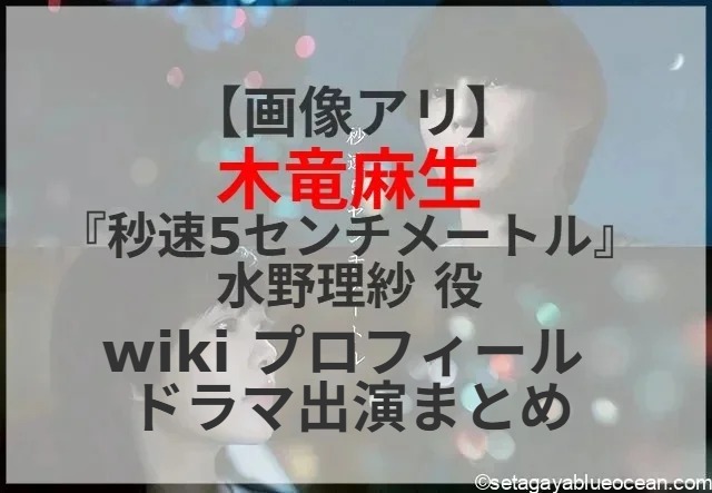 「君の名は。」「すずめの戸締まり」の新海誠監督による2007年公開の劇場アニメーション「秒速5センチメートル(2007)」を、「SixTONES」の松村北斗主演で実写映画化。遠野貴樹の会社の同僚・水野理紗役を木竜麻生さんが演じる。木竜麻生さんのプロフィールは? これまでの出演したテレビドラマは?