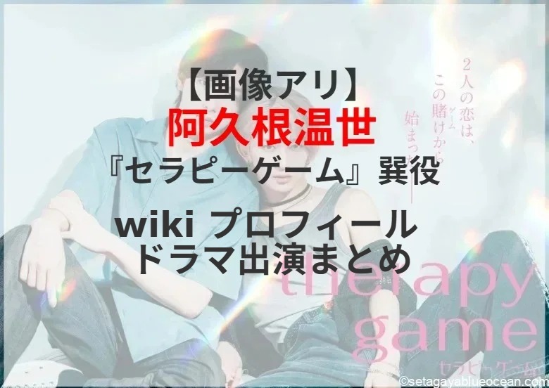 ダンスボーカルグループ「MAZZEL」のNAOYA(22)と、オルタナティブ歌謡舞踊集団「龍宮城」の冨田侑暉(20)が日本テレビの連続ドラマ「セラピーゲーム」(10月29日スタート、水曜・深夜0時59分)にダブル主演する。獣医学生・生嶋静真(冨田侑暉)の同級生・巽役を阿久根温世さんが演じる。阿久根温世さんのプロフィール? これまで出演したテレビドラマは?