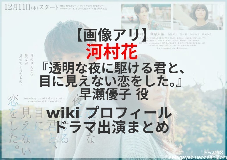 永瀬莉子と藤原大祐がW主演を務めるMBSドラマ特区『透明な夜に駆ける君と、目に見えない恋をした。』(MBSほか 12月11日(木)スタート 毎週木曜 深夜0時59分~)人との関わりにトラウマを持つ大学生・空野かける(藤原大祐)の幼なじみで目の見えないヒロイン・冬月小春(永瀬莉子)の親友でもある早瀬優子役を河村花さんが演じる。河村花さんのプロフィールは? これまで出演したテレビドラマは?