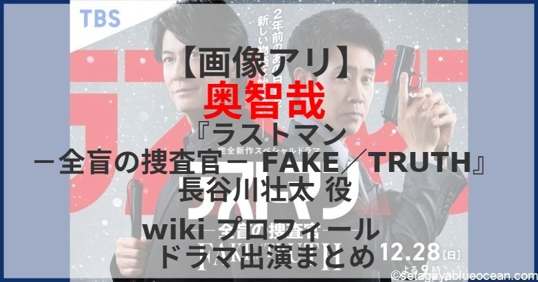 福山雅治と大泉洋がバディを組む『ラストマン-全盲の捜査官-』の完全新作スペシャルドラマ『ラストマン-全盲の捜査官- FAKE/TRUTH』が、12月28日午後9時から放送される。捜査一課・佐久良班の若手刑事・長谷川壮太役を奥智哉さんが演じる。奥智哉さんのプロフィールは? これまで出演したテレビドラマは?
