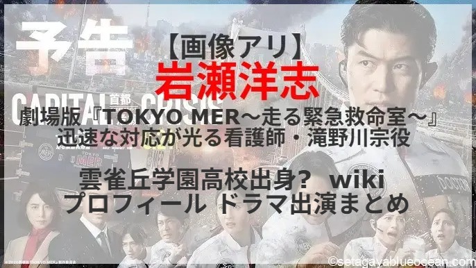 「待っているだけじゃ、助けられない命がある」という信念を持つチーフドクター・喜多見幸太役の鈴木亮平を主演とする2021年にTBS日曜劇場枠で放送されたドラマ『TOKYO MER~走る緊急救命室~』の第3弾劇場版『TOKYO MER~走る緊急救命室~CAPITAL CRISIS』が8月21日に公開。新メンバーとして、チームの雰囲気を和ませる存在感があるが、過酷な現場では一転して冷静かつ迅速な対応が光る看護師・滝野川宗役を岩瀬洋志さんが演じる。岩瀬洋志さんの出身高校は? プロフィールは? これまで出演したテレビドラマは?