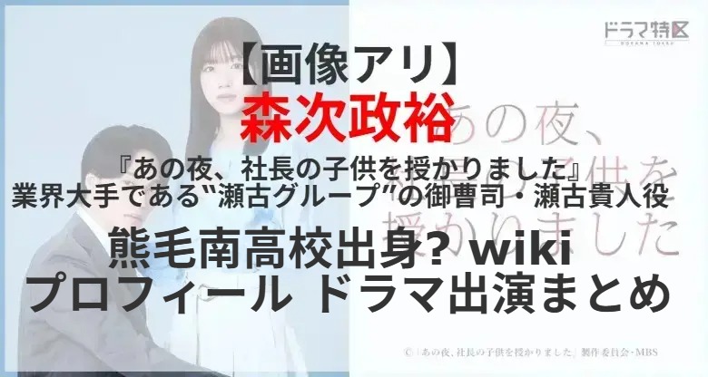 元日向坂46の佐々木美玲と超特急・森次政裕のW主演ドラマ『あの夜、社長の子供を授かりました』が4月16日(木)よりドラマ特区枠(MBS/tvkほか)にて放送。失意のどん底に落とされ酔い潰れた花井栞里(佐々木美玲) と一夜を共にした、業界大手である“瀬古グループ”の御曹司・瀬古貴人役を森次政裕さんが演じる。森次政裕さんの出身高校は? プロフィールは? これまで出演したテレビドラマは?