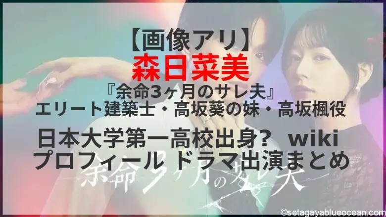 白洲迅が主演を務め、桜井日奈子がヒロインを演じる4月24日スタートのドラマ『余命3ヶ月のサレ夫』(テレビ朝日系/毎週金曜23時15分)。大手ゼネコン「帝央建設」都市デザイン部のエリート建築士・高坂葵(白洲迅)の妹でカメラマンの高坂楓役を森日菜美さんが演じる。森日菜美さんの出身高校は? プロフィールは? これまで出演したテレビドラマは?