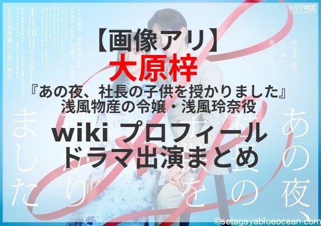 元日向坂46の佐々木美玲と超特急・森次政裕のW主演ドラマ『あの夜、社長の子供を授かりました』が4月16日(木)よりドラマ特区枠(MBS/tvkほか)にて放送。瀬古グループに次ぐ業界第2位・浅風物産の令嬢で貴人(森次政裕)の許嫁でもある浅風玲奈役を大原梓さんが演じる。大原梓さんのプロフィールは? これまで出演したテレビドラマは?