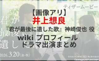 J_Entertainment【画像アリ】井上想良 『君が最後に遺した歌』神崎俊也 役 wiki プロフィール ドラマ出演まとめ 7人組グループ・なにわ男子の道枝駿佑が初の単独主演、生見愛瑠がヒロインを務める映画『君が最後に遺した歌』(2026年3月20日公開)。詩作を趣味とする主人公・水嶋春人(道枝駿佑)と発達性ディスレクシアを抱えながらも歌唱と作曲の才能を持つヒロ... 2025.12.17J_Entertainment